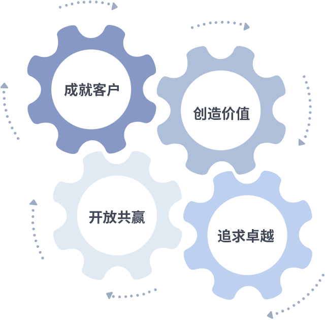 成就客户是一切决策的出发点,,,创造价值是衡量所有工作的标准,,追求卓越是我们做事做人的态度,,开放共赢是我们的格局也是最终的结果。。价值观的齿轮环环相扣,,,推动着组织里的每个人不断向前。。。